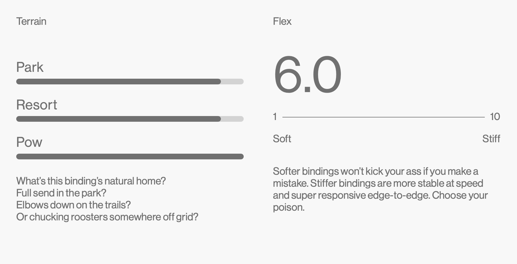 - 6/10 – Flex mediu, perfect pentru o experiență versatilă pe pârtie. Ideale pentru riderii care adoră viteza pe și în afara pârtiei, dar și pentru freestyle, sărituri, rail-uri și box-uri în snowpark. Flexul mediu oferă transfer direct de putere și control optim.